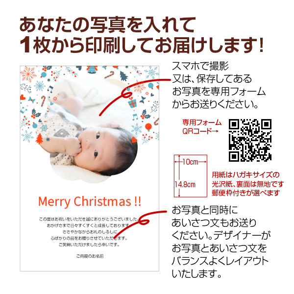 送信いただいた写真をデザイナーが加工・レイアウトし素敵なカードに仕上げます。