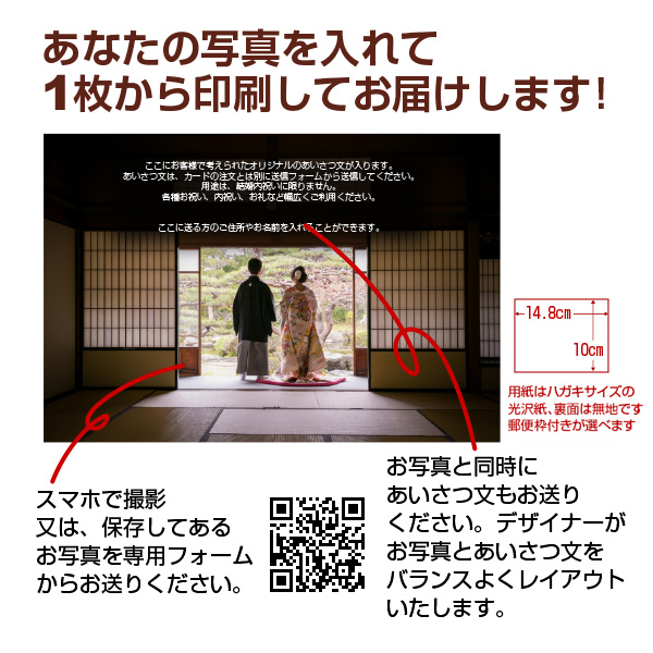 送信いただいた写真をデザイナーが加工・レイアウトし素敵なカードに仕上げます。