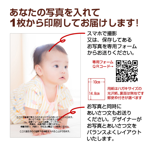 送信いただいた写真をデザイナーが加工・レイアウトし素敵なカードに仕上げます。