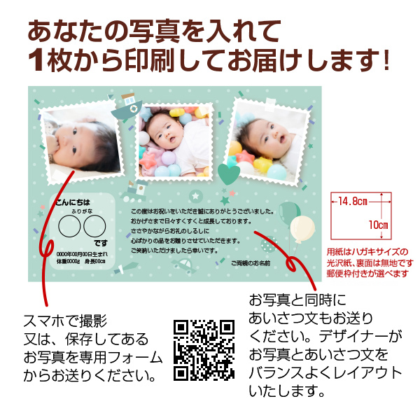 送信いただいた写真をデザイナーが加工・レイアウトし素敵なカードに仕上げます。